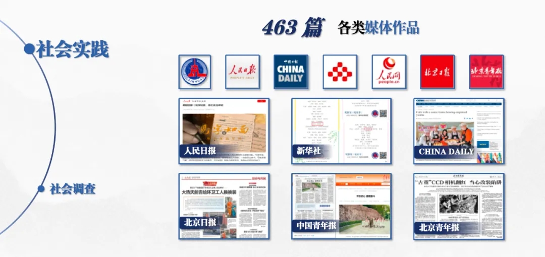调查研究是谋事之基、成事之道。2021级新闻学班的同学们将视线聚焦建设成就、乡村振兴、非遗传承、民生服务等方方面面,前往全国24个省市开展调查研究,共产出84篇调研报告、21部视听作品,19人次、9部作品在首都“挑战杯”竞赛中获奖。他们带着所思所想参加“子牛杯”社会调查大赛颁奖典礼,徐布恩作为学生代表讲述在雄安新区调研时的所获所得。同学们奔赴实践岗位,在人民日报、新华社、中国青年报等多家主流媒体发表作品463篇,用脚步丈量时代发展、用笔触传递“青年方案”。