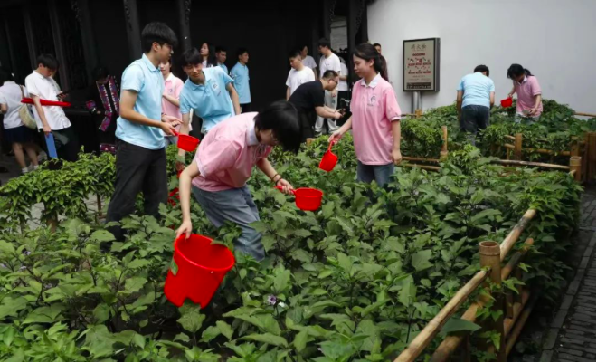 在周恩来故居院中有一口水井,水井不远处有一块小菜地,周恩来幼年时从水井中取水,在这里种瓜种菜。研学班学员和淮安高校同学们一起在水井吊水,浇灌小菜园里的蔬菜,沉浸式感受周恩来总理小时候的劳动生活。来自淮阴师范学院“周恩来班”的少数民族大学生格外活跃,他们身着华丽的民族服饰与身穿汉服的同学们一同互动体验劳动的场景,构成了一幅温馨而动人的风景。大家互帮互助,在劳动中饮水思源,感恩今天的幸福生活。